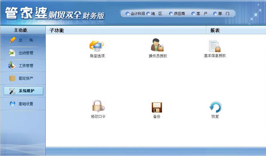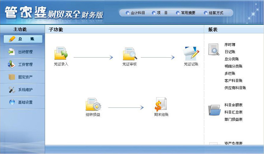 提供规范的会计核算凭证帐表以及客户、供应商、部门、个人、项目等辅助核算,满足企业财务精细化管理的要求。全面支持新会计准则。